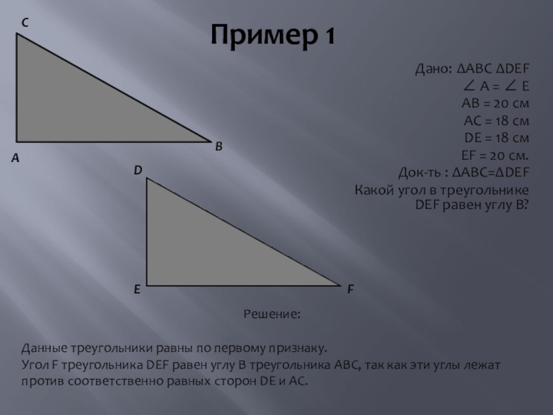 Угол F треугольника DEF равен углу В треугольника ABC, так как эти углы лежат против соответственно равных сторон DE и АС.