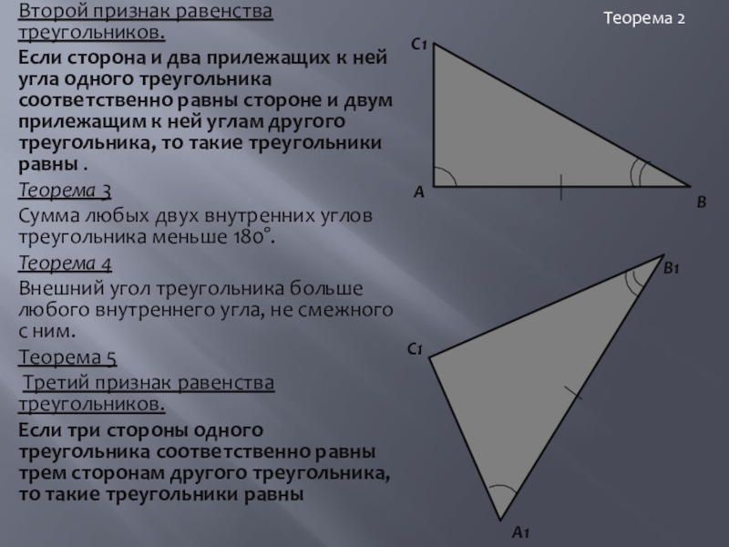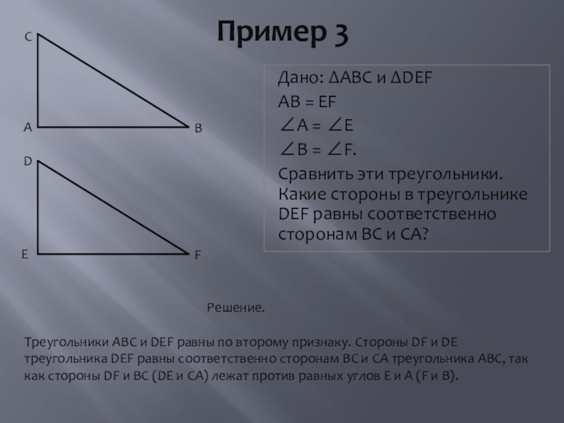 Треугольники ABC и DEF равны по второму признаку. Стороны DF и DE треугольника DEF равны соответственно сторонам ВС и СА треугольника ABC, так как стороны DF и ВС (DE и СА) лежат против равных углов Е и A (F и В).