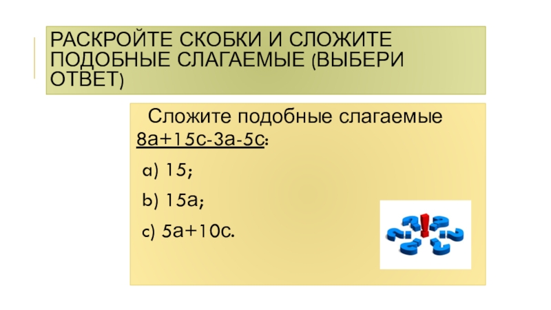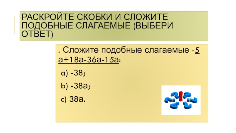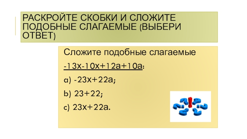 Слайд 10Раскройте скобки и сложите подобные слагаемые (выбери ответ)