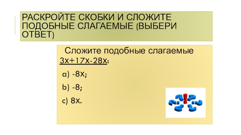 Слайд 13Раскройте скобки и сложите подобные слагаемые (выбери ответ)