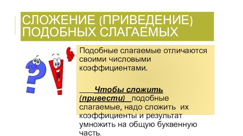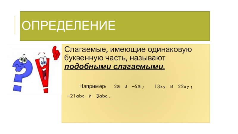 Слагаемые, имеющие одинаковую буквенную часть, называют подобными слагаемыми.