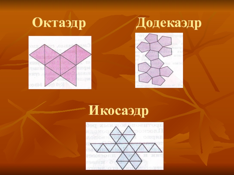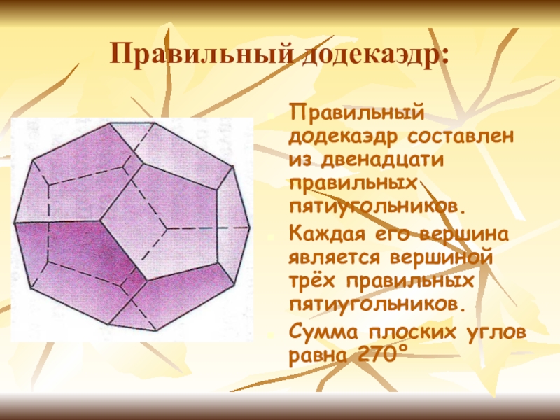 Правильный додекаэдр:Правильный додекаэдр составлен из двенадцати правильных пятиугольников. Каждая его вершина является вершиной трёх правильных пятиугольников.Сумма плоских