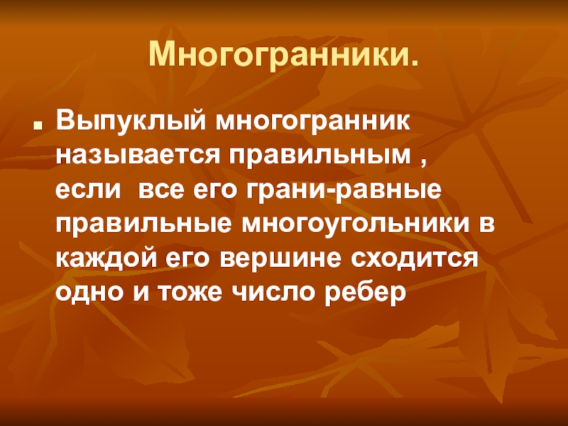 Выпуклый многогранник называется правильным , если все его грани-равные правильные многоугольники