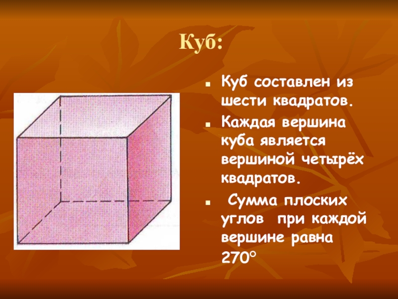 Куб:Куб составлен из шести квадратов. Каждая вершина куба является вершиной четырёх квадратов. Сумма плоских углов при каждой