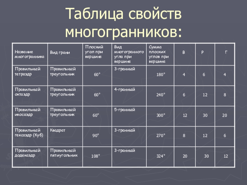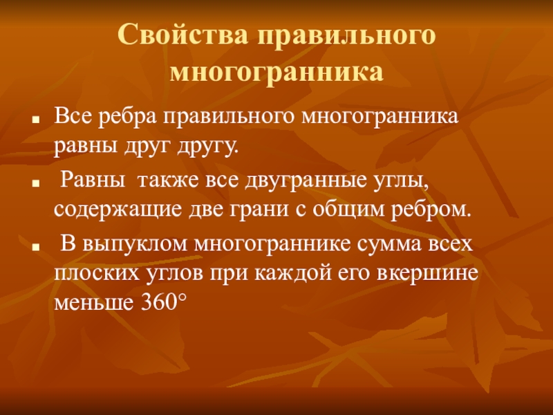 Свойства правильного многогранникаВсе ребра правильного многогранника равны друг другу. Равны также все двугранные углы, содержащие две грани