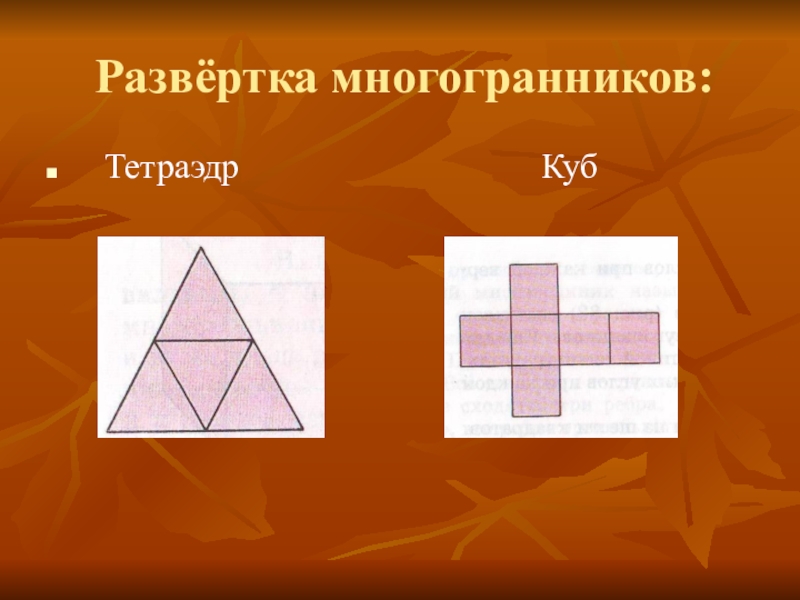 Правильный тетраэдр:Правильный тетраэдр составлен из четырёх равносторонних треугольников. Каждая его вершина является вершиной трех треугольников. Сумма плоских