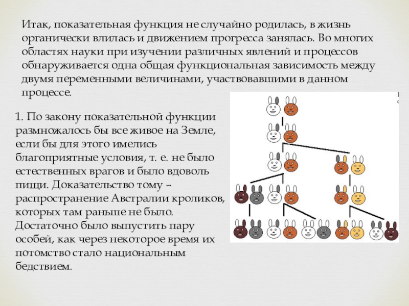 1. По закону показательной функции размножалось бы все живое на Земле, если бы для этого имелись благоприятные условия, т. е. не было естественных врагов и было вдоволь пищи. Доказательство тому – распространение Австралии кроликов, которых там раньше не было. Достаточно было выпустить пару особей, как через некоторое время их потомство стало национальным бедствием.