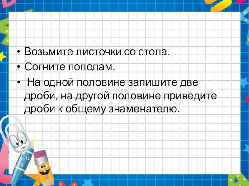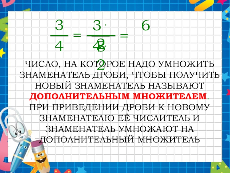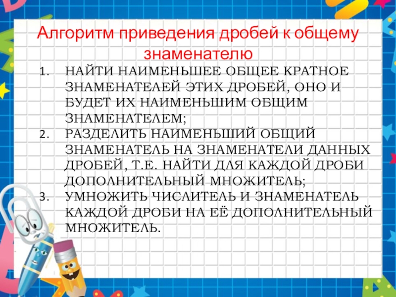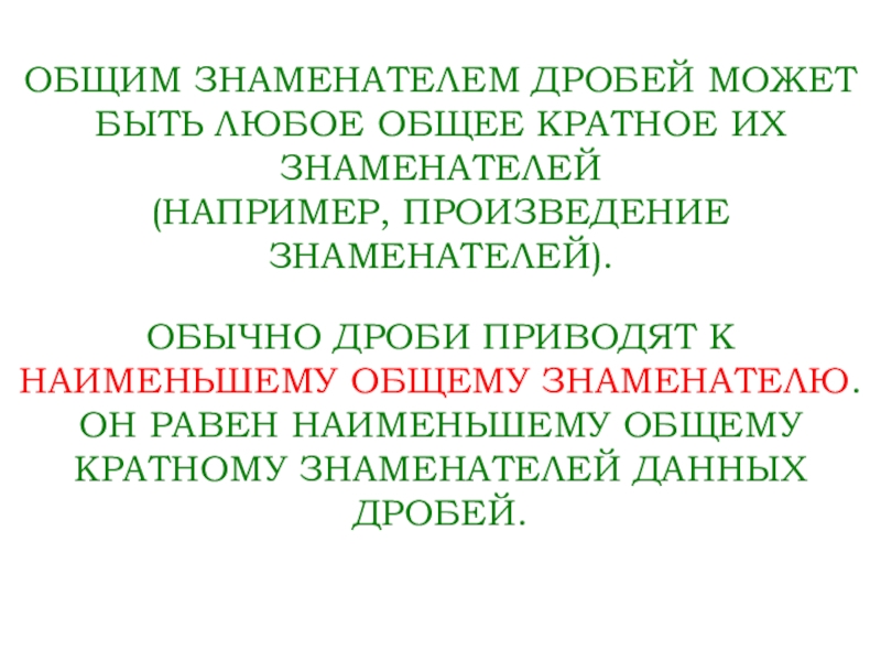 ОБЫЧНО ДРОБИ ПРИВОДЯТ К НАИМЕНЬШЕМУ ОБЩЕМУ ЗНАМЕНАТЕЛЮ. ОН РАВЕН НАИМЕНЬШЕМУ ОБЩЕМУ КРАТНОМУ ЗНАМЕНАТЕЛЕЙ ДАННЫХ ДРОБЕЙ.