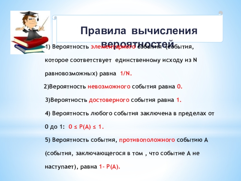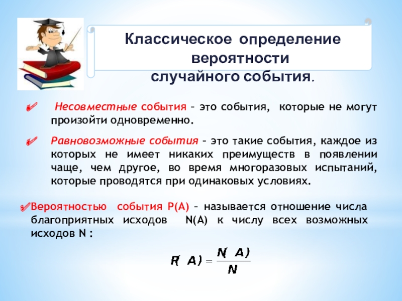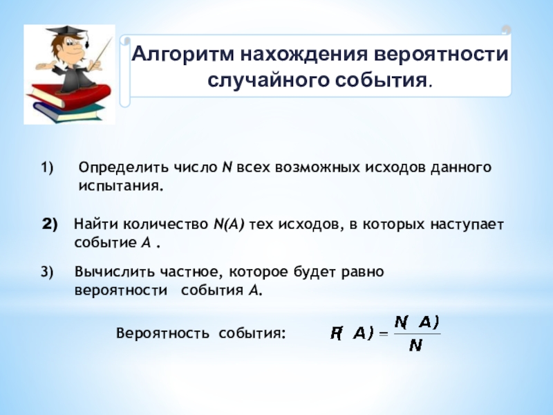 Вероятностью события Р(А) – называется отношение числа благоприятных исходов N(A) к числу всех возможных исходов N :