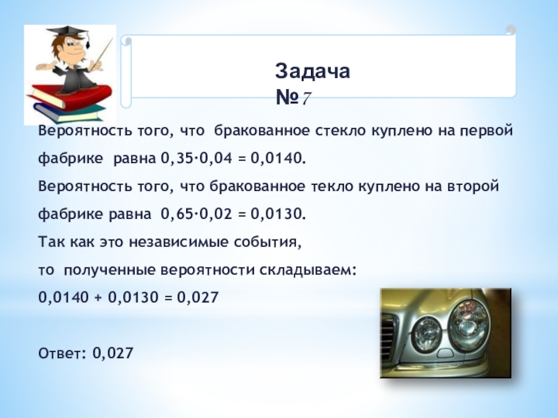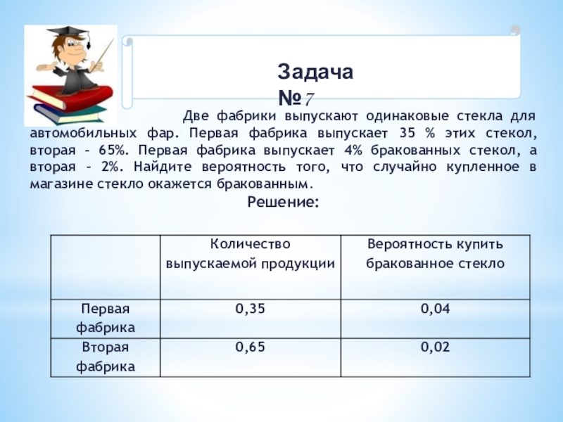 Вероятность того, что бракованное стекло куплено на первой фабрике равна 0,35∙0,04 = 0,0140.