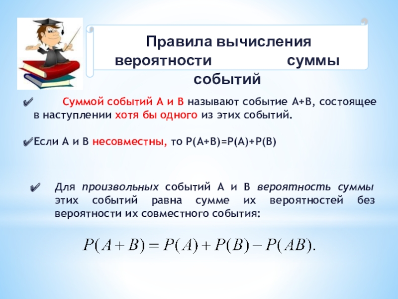 Для произвольных событий А и В вероятность суммы этих событий равна сумме их вероятностей без вероятности их совместного события: