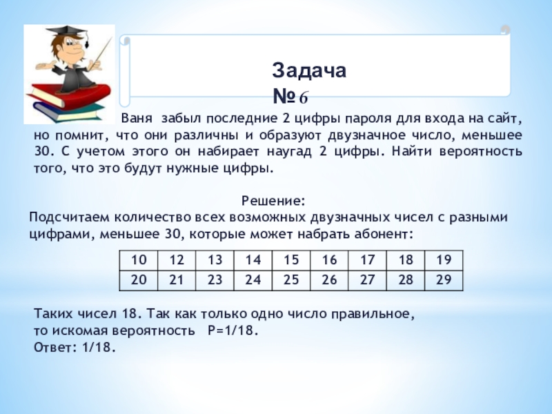 Таких чисел 18. Так как только одно число правильное, то искомая вероятность Р=1/18.