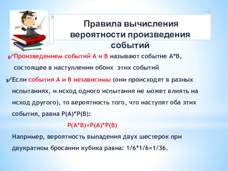 Например, вероятность выпадения двух шестерок при двукратном бросании кубика равна: 1/6*1/6=1/36.