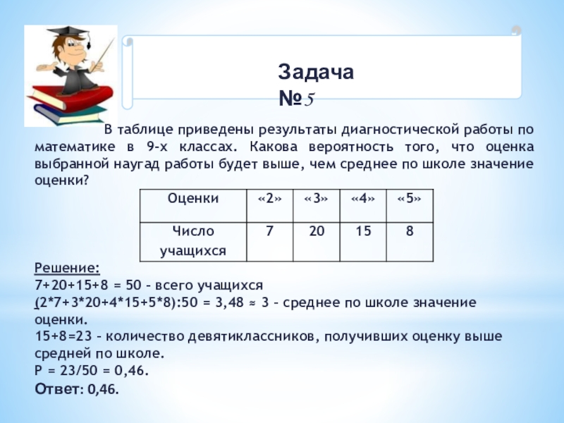 15+8=23 – количество девятиклассников, получивших оценку выше средней по школе.