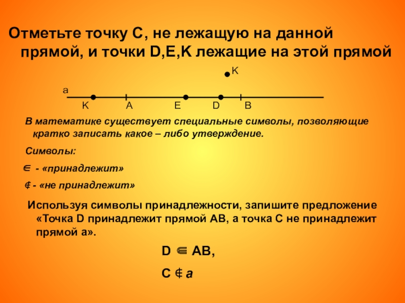 Используя символы принадлежности, запишите предложение «Точка D принадлежит прямой АВ, а точка С не принадлежит прямой а».