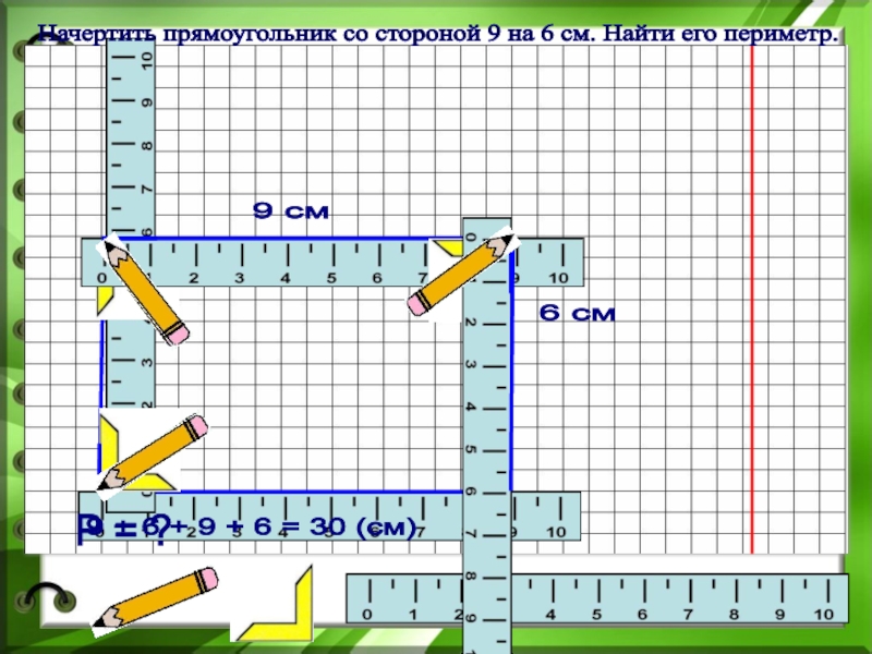 Начертить прямоугольник со стороной 9 на 6 см. Найти его периметр.