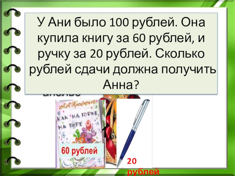 У Ани было 100 рублей. Она купила книгу за 60 рублей, и ручку за 20 рублей. Сколько рублей сдачи должна получить Анна?