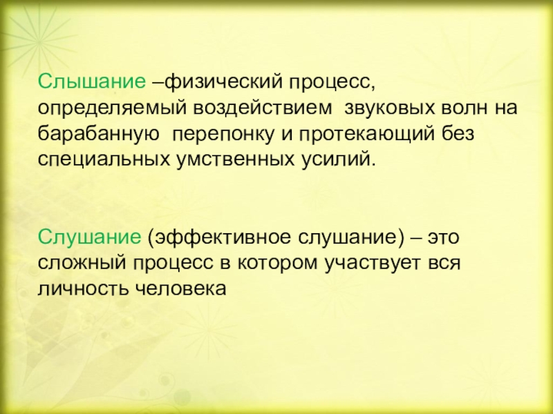 Слышание –физический процесс, определяемый воздействием звуковых волн на барабанную перепонку и протекающий без специальных умственных усилий.Слушание (эффективное
