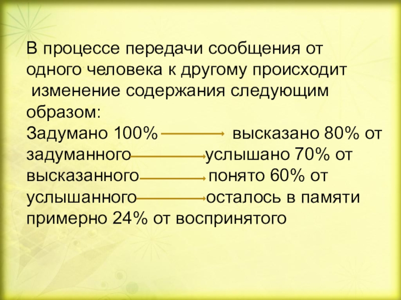 Задумано 100% высказано 80% от задуманного услышано 70% от высказанного понято 60% от услышанного осталось в памяти примерно 24% от воспринятого
