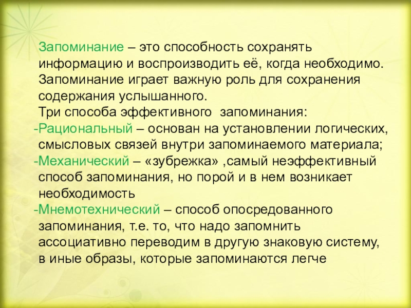 Механический – «зубрежка» ,самый неэффективный способ запоминания, но порой и в нем возникает необходимость