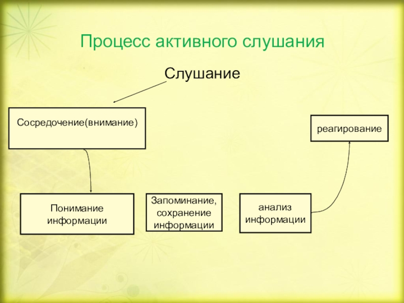 Процесс активного слушания Слушание Сосредочение(внимание)Понимание информацииЗапоминание,сохранение информации анализ информацииреагирование