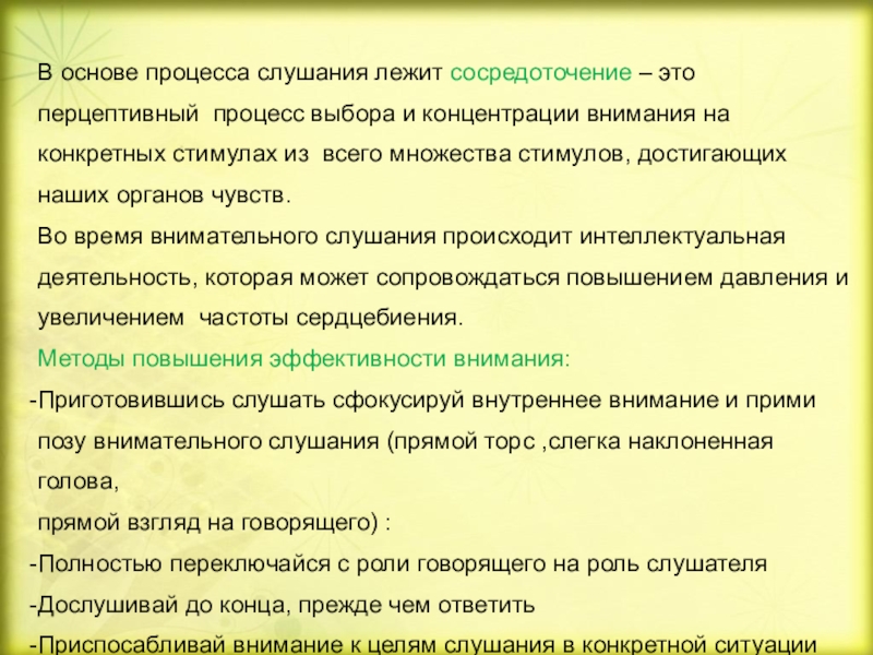 В основе процесса слушания лежит сосредоточение – это перцептивный процесс выбора и концентрации внимания на конкретных стимулах