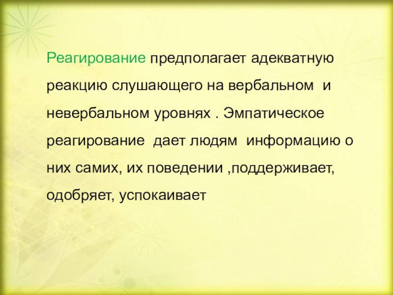 Реагирование предполагает адекватную реакцию слушающего на вербальном и невербальном уровнях . Эмпатическое реагирование дает людям информацию о