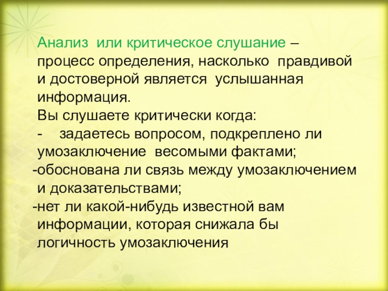 Анализ или критическое слушание – процесс определения, насколько правдивой и достоверной является услышанная информация.Вы слушаете критически когда:
