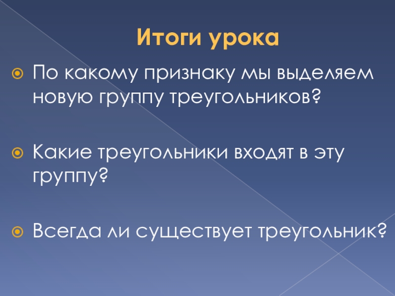 Итоги урокаПо какому признаку мы выделяем новую группу треугольников?Какие треугольники входят в эту группу?Всегда ли существует треугольник?