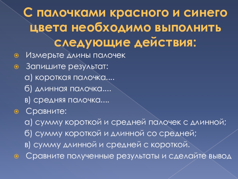 Слайд 10С палочками красного и синего цвета необходимо выполнить следующие действия: