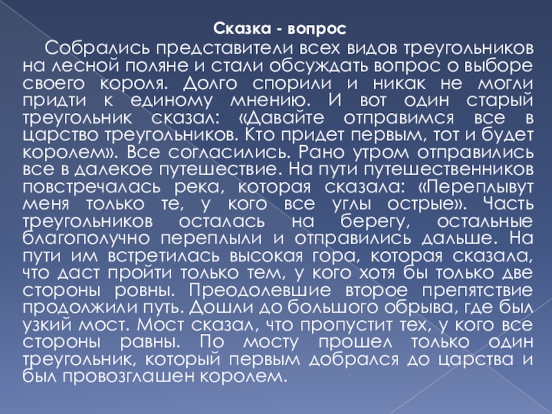 стали обсуждать вопрос о выборе своего короля. Долго спорили и никак не могли придти к единому мнению. И вот один старый треугольник сказал: «Давайте отправимся все в царство треугольников. Кто придет первым, тот и будет королем». Все согласились. Рано утром отправились все в далекое путешествие. На пути путешественников повстречалась река, которая сказала: «Переплывут меня только те, у кого все углы острые». Часть треугольников осталась на берегу, остальные благополучно переплыли и отправились дальше. На пути им встретилась высокая гора, которая сказала, что даст пройти только тем, у кого хотя бы только две стороны ровны. Преодолевшие второе препятствие продолжили путь. Дошли до большого обрыва, где был узкий мост. Мост сказал, что пропустит тех, у кого все стороны равны. По мосту прошел только один треугольник, который первым добрался до царства и был провозглашен королем.