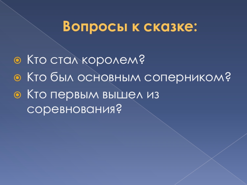Вопросы к сказке:Кто стал королем?Кто был основным соперником?Кто первым вышел из соревнования?