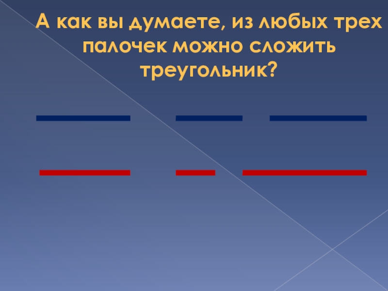 Слайд 9А как вы думаете, из любых трех палочек можно сложить треугольник?