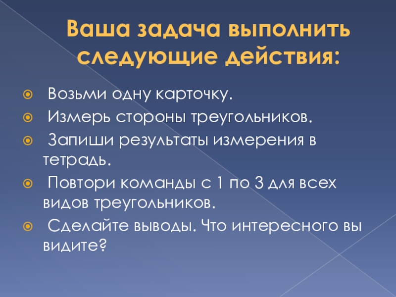 Ваша задача выполнить следующие действия: Возьми одну карточку. Измерь стороны треугольников. Запиши результаты измерения в тетрадь. Повтори