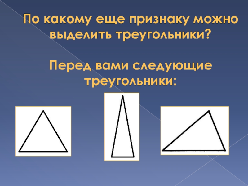 Слайд 3По какому еще признаку можно выделить треугольники? Перед вами следующие треугольники: