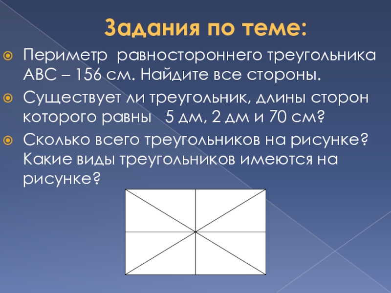 Задания по теме:Периметр равностороннего треугольника АВС – 156 см. Найдите все стороны.Существует ли треугольник, длины сторон которого