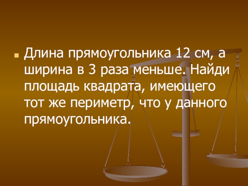 Длина прямоугольника 12 см, а ширина в 3 раза меньше. Найди площадь квадрата, имеющего тот же периметр,