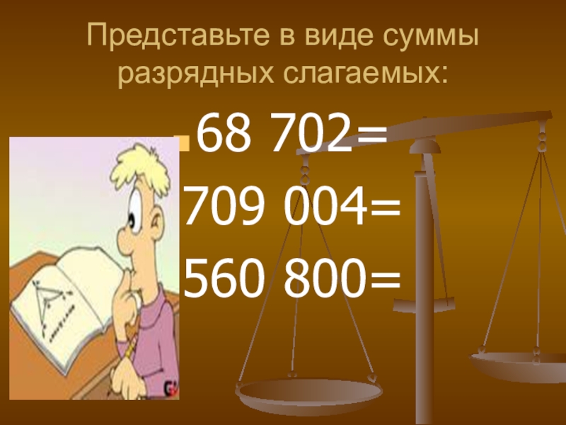 Представьте в виде суммы разрядных слагаемых:68 702=709 004=560 800=