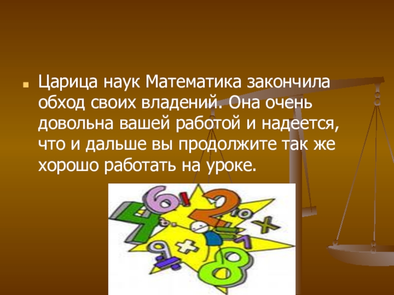 Царица наук Математика закончила обход своих владений. Она очень довольна вашей работой и надеется, что и дальше