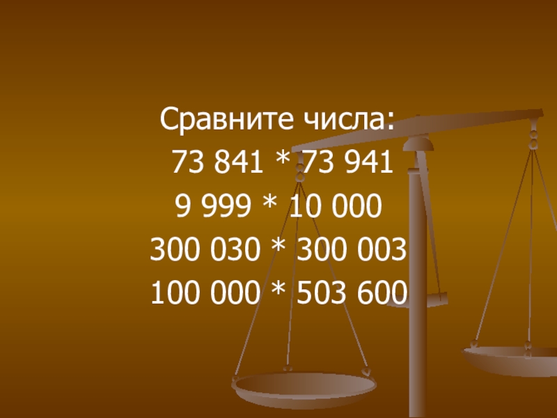 Сравните числа: 73 841 * 73 9419 999 * 10 000300 030 * 300 003100 000 * 503 600