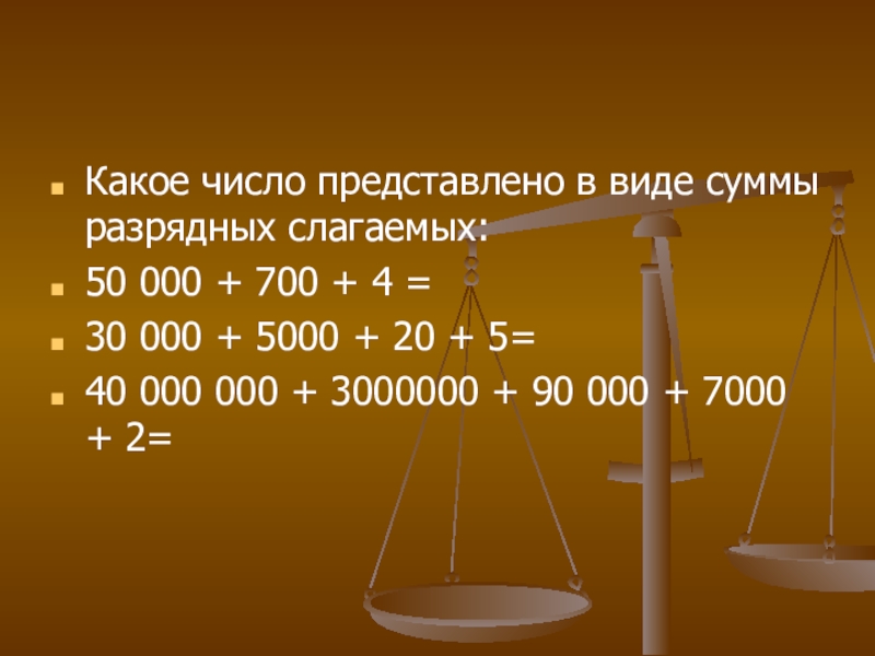 Какое число представлено в виде суммы разрядных слагаемых:50 000 + 700 + 4 = 30 000 + 5000 +