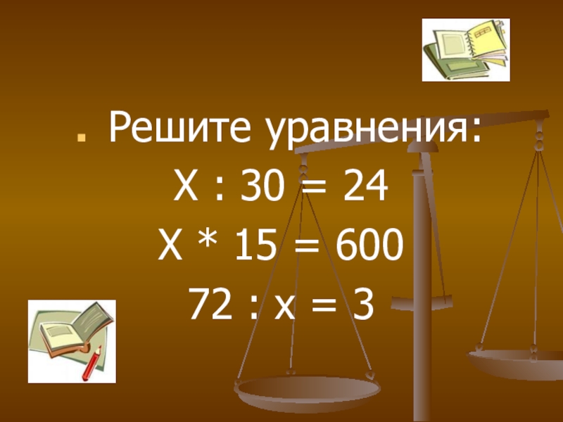 Решите уравнения:Х : 30 = 24Х * 15 = 60072 : х = 3