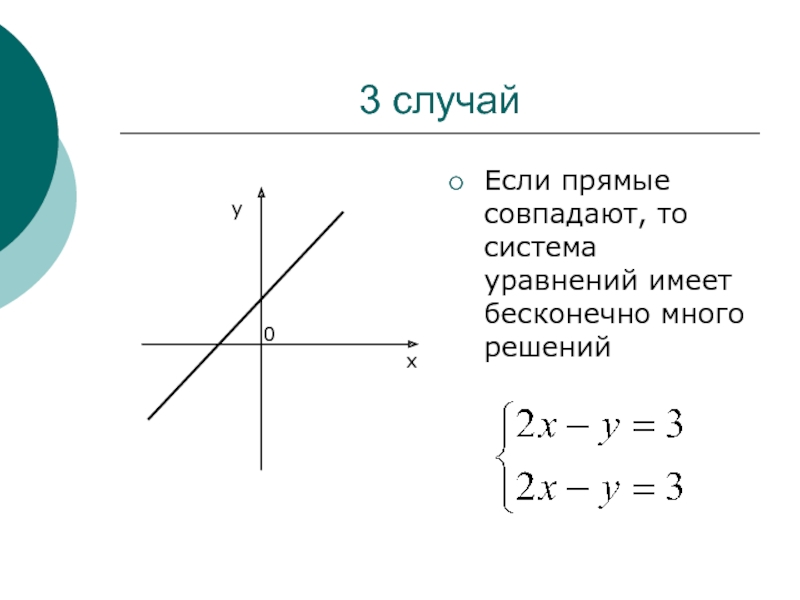 3 случайЕсли прямые совпадают, то система уравнений имеет бесконечно много решенийух0