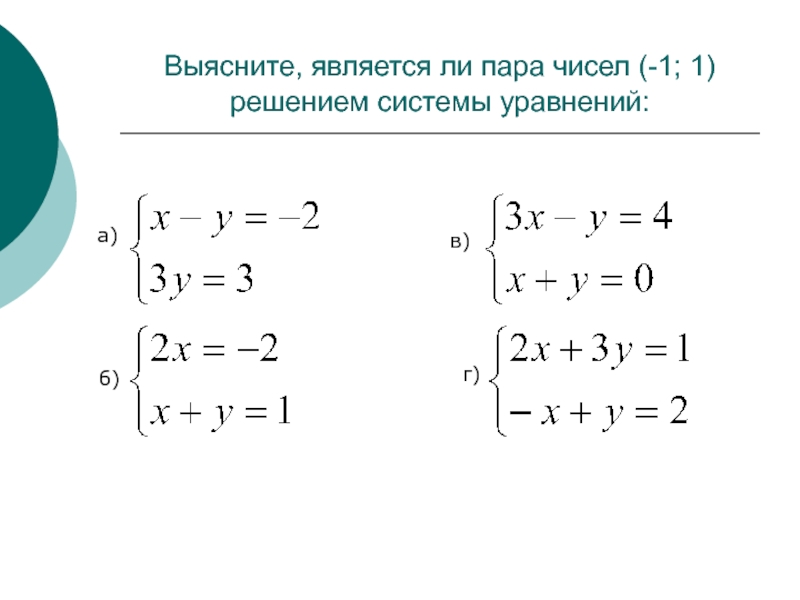 Выясните, является ли пара чисел (-1; 1) решением системы уравнений:а)б)в)г)