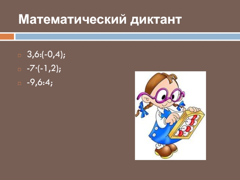 Математический диктант  3,6:(-0,4);-7·(-1,2);-9,6:4;