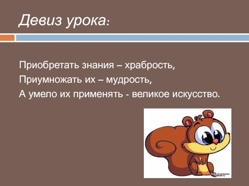 Девиз урока:Приобретать знания – храбрость, Приумножать их – мудрость, А умело их применять - великое искусство.