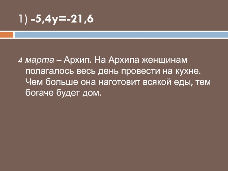 1) -5,4y=-21,6 4 марта – Архип. На Архипа женщинам полагалось весь день провести на кухне. Чем больше