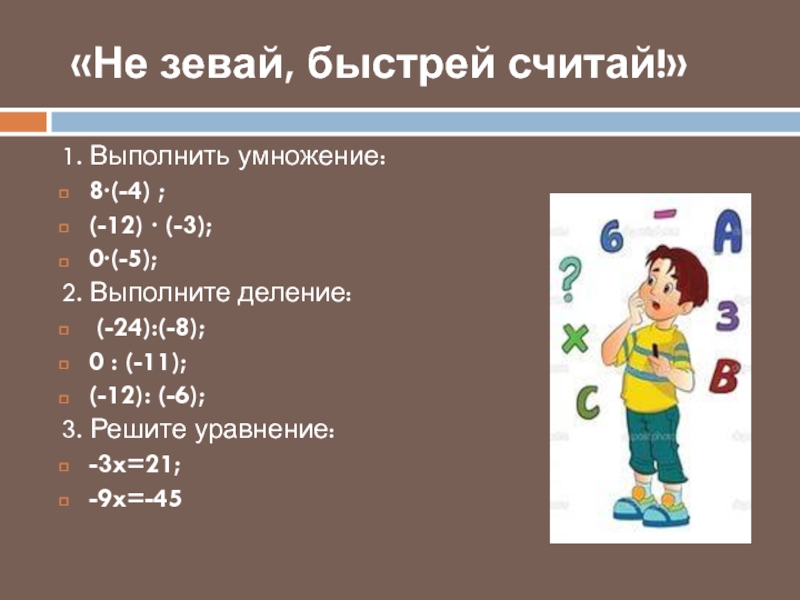 «Не зевай, быстрей считай!» 1. Выполнить умножение: 8∙(-4) ;(-12) ∙ (-3);0∙(-5);2. Выполните деление: (-24):(-8);0 : (-11);(-12):