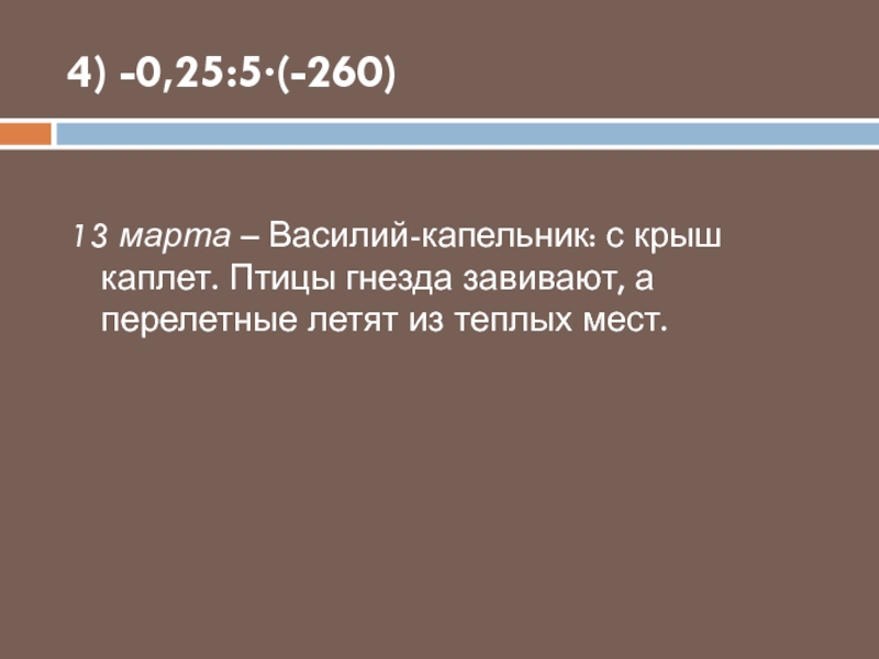 4) -0,25:5·(-260) 13 марта – Василий-капельник: с крыш каплет. Птицы гнезда завивают, а перелетные летят из теплых