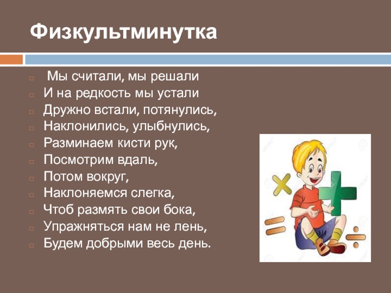 Физкультминутка  Мы считали, мы решалиИ на редкость мы усталиДружно встали, потянулись,Наклонились, улыбнулись,Разминаем кисти рук,Посмотрим вдаль,Потом